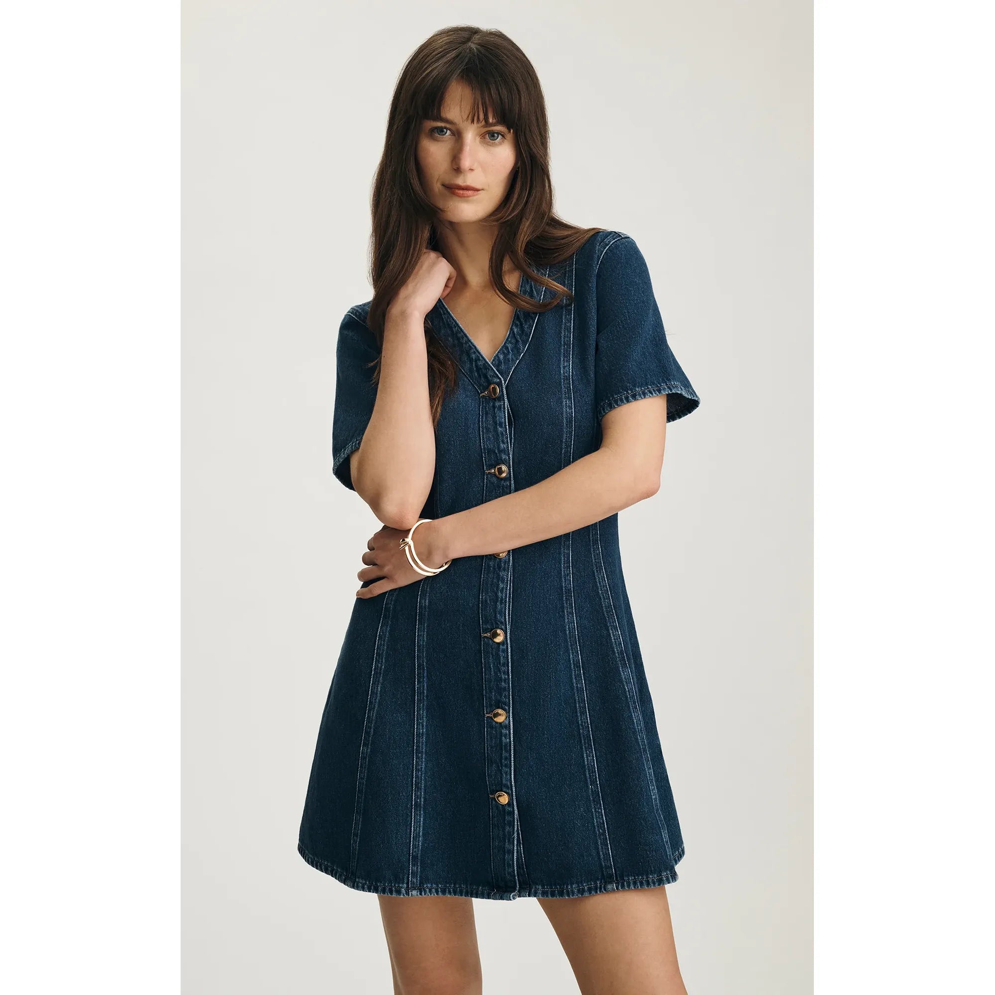 Kristy features a flattering fit-and-flare silhouette with a classic button-up front. Finished with a V-neck and short sleeves, this dress is perfect for warm-weather plans. This style comes in a true dark blue wash.