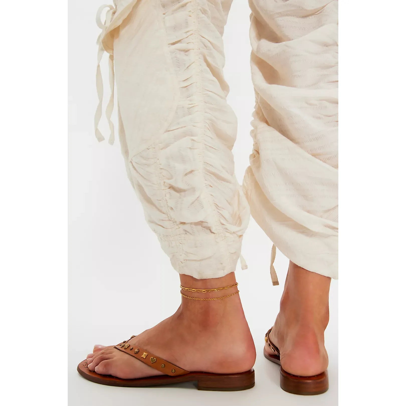 - Leather thong straps with metal embellishments