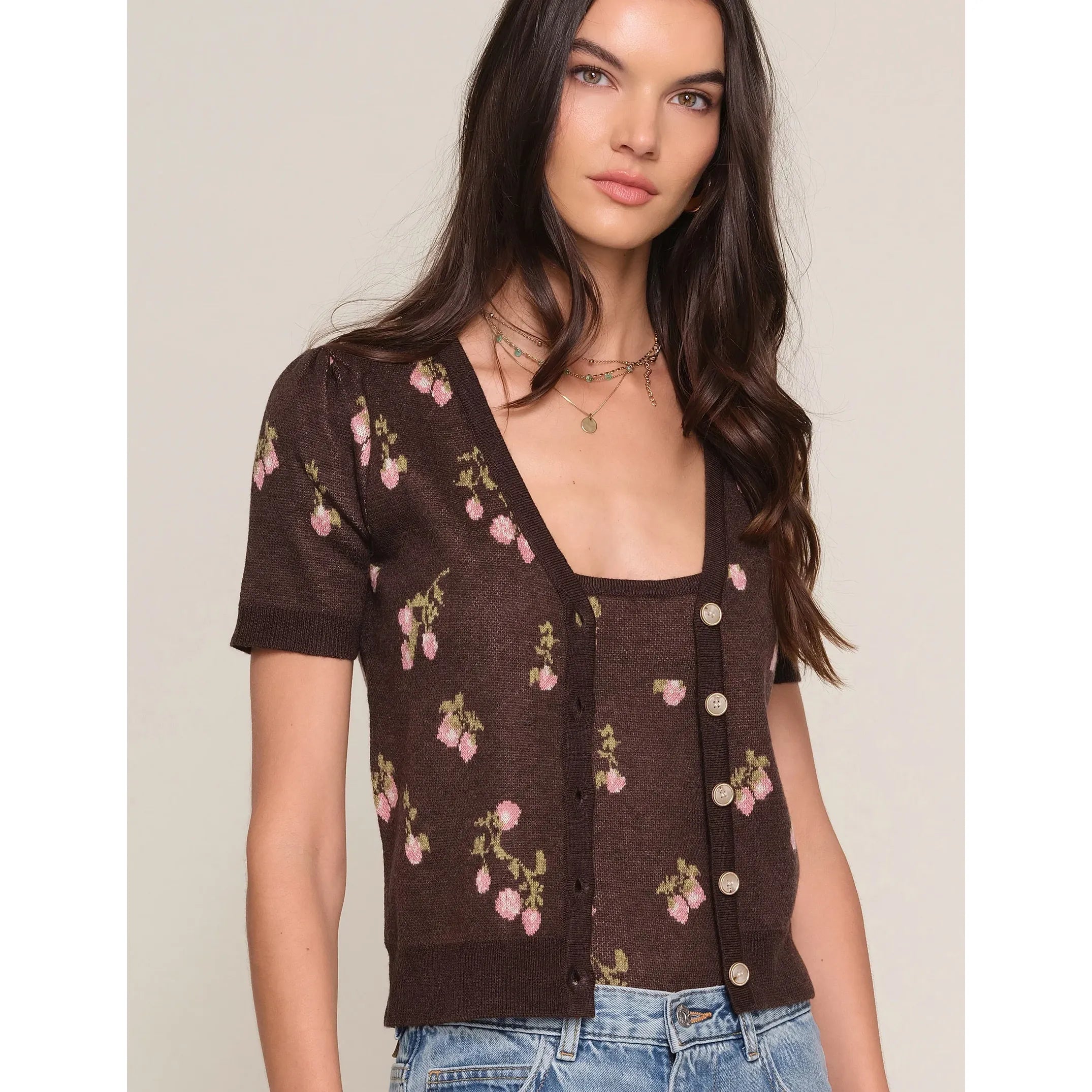 The Jodene Cardi is a soft knit with a strawberry, jacquard throughout. It has a slim fit and is made to match our Dany Cami.