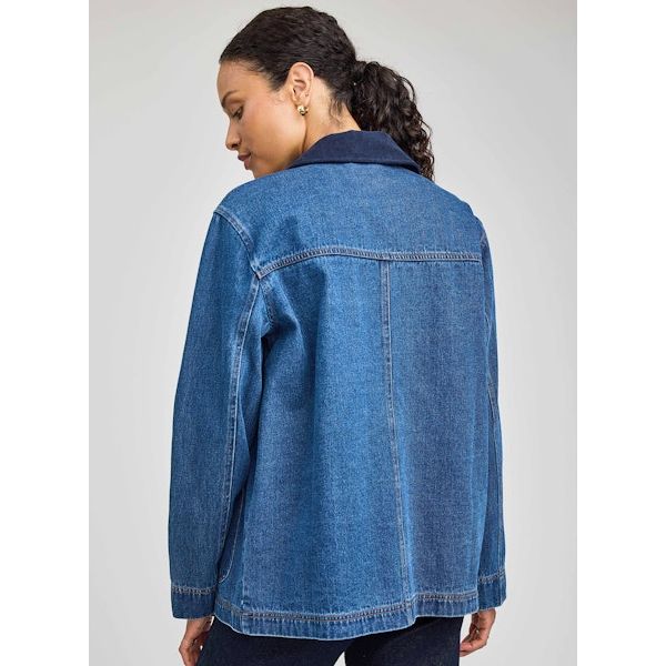 The Flynn jacket is made of a heavy weight denim fabric that has been specially washed for a perfectly lived-in look. The effortless silhouette features patch pockets and a contrast corduroy collar.