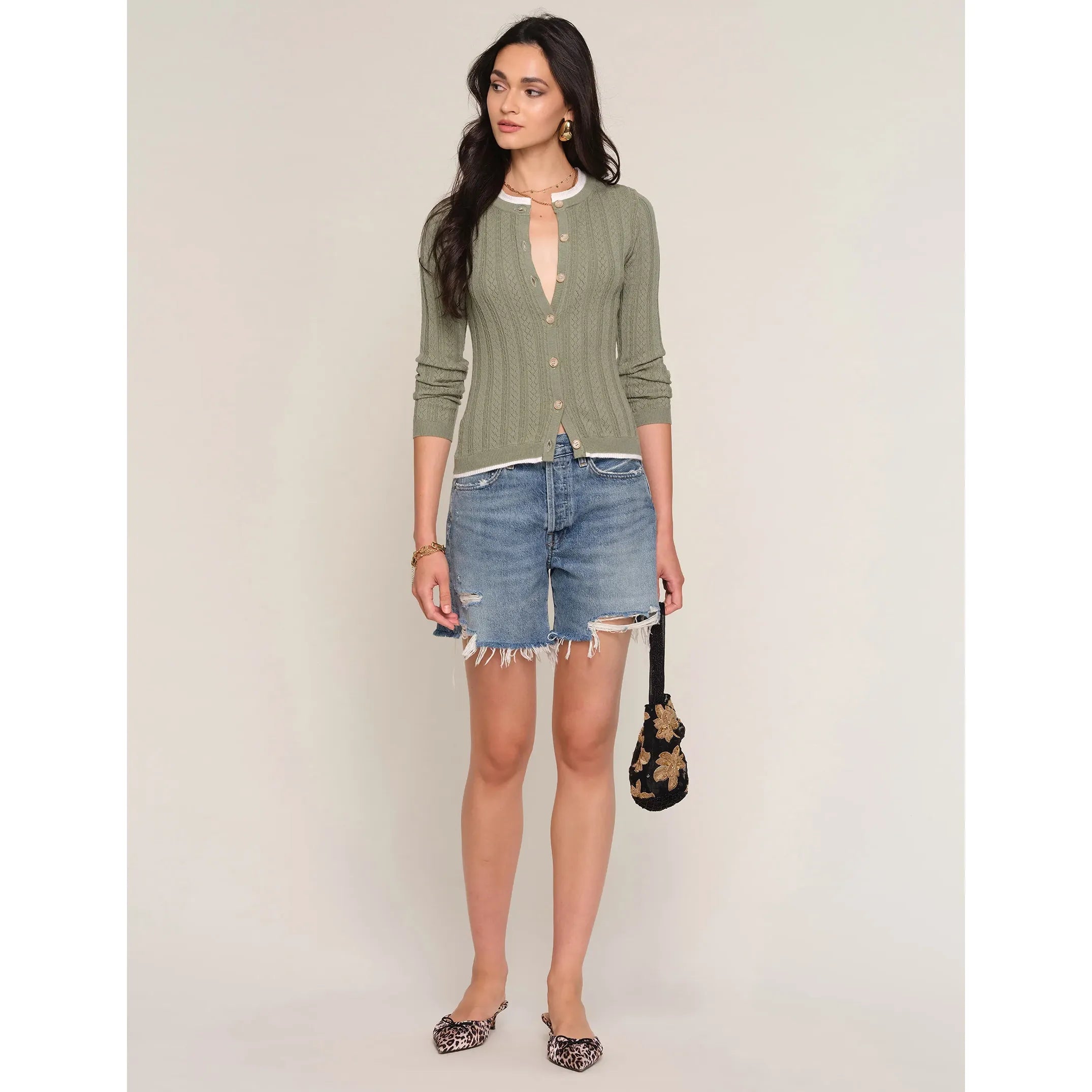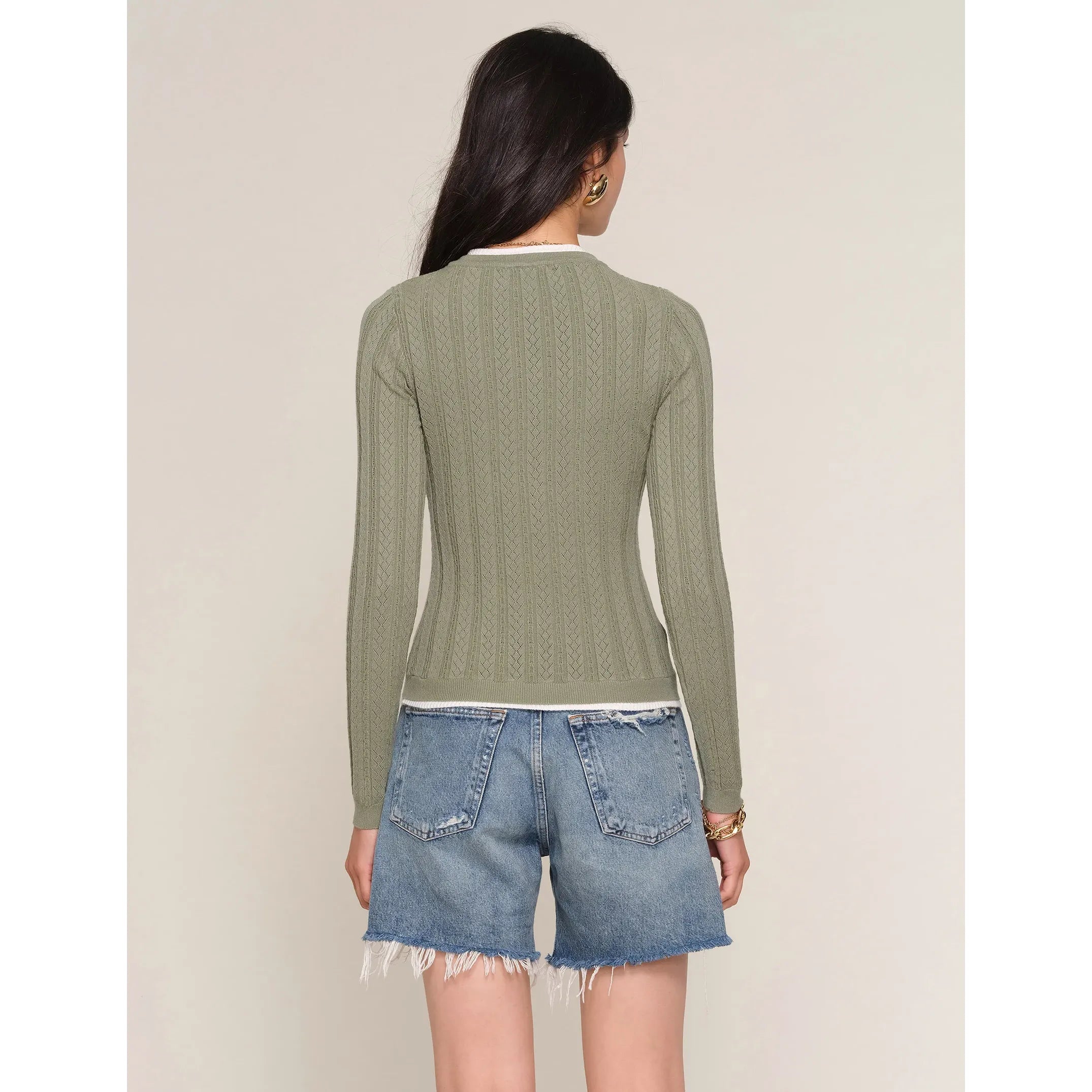The Tommy Cardi is a light weight, slim fit sweater. It features a delicate, cable stitch throughout the body, and a contrast edge at neck and hem.