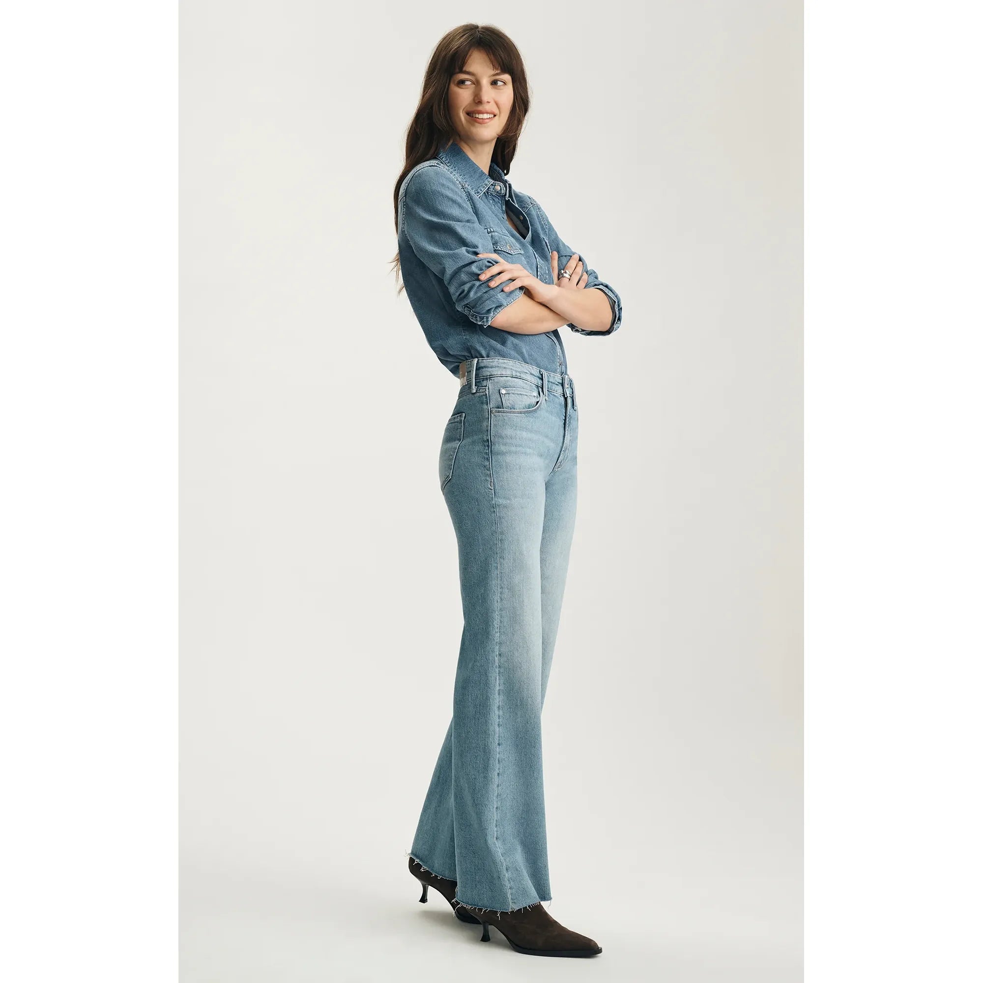 Grace pairs a sleek mid rise with a relaxed flare and an effortlessly undone raw hem, creating a silhouette that's both casual and bold. This pair comes in a bleached blue wash with a vintage-inspired finish.